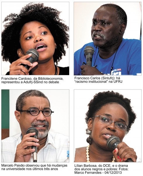 No seminário, a professora Francilene Cardoso destacou que a UFRJ reflete a realidade da sociedade. Observou que a universidade possui mais de três mil professores, mas que entre estes, são pouquíssimos os que são negros. Os negros são encontrados na UFRJ em funções subalternas, registrou. Francilene, que também é militante do movimento “Favela não se cala”, criticou as UPPs que, na sua opinião, não constituem “uma política de segurança pública”, mas uma ação voltada para organizar a cidade de acordo com “os interesses do mercado”. Francilene atacou o governo do PT em relação à realidade enfrentada pela população negra. “O PT faz a gestão da barbárie”, acusou.