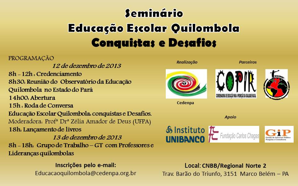 As inscrições podem ser enviadas para o email educacaoquilombola@cedenpa.quijaua.net.br